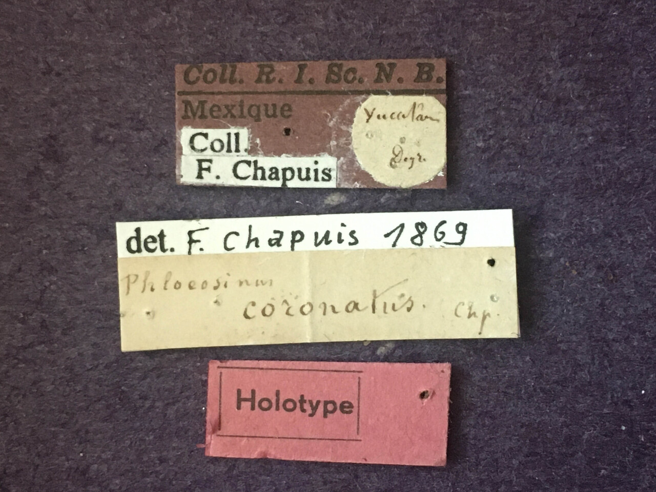 seen 2010 3 labels: (1) purple 'Coll R.I.Sc. N.B. Mexique'. glued on circle 'Yucatan Deyr.' glued on label 'Coll. F.Chapuis'; (2) white, 'det. F. Chapuis 1869, Phloeosinus coronatus Chap.'; (3) faded red 'Holotype'