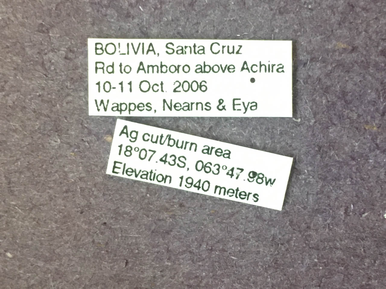 | Bolivia | Santa Cruz Department | Achira, 4-5 km N, road to Floripondo | -18.15 | -63.7833 |