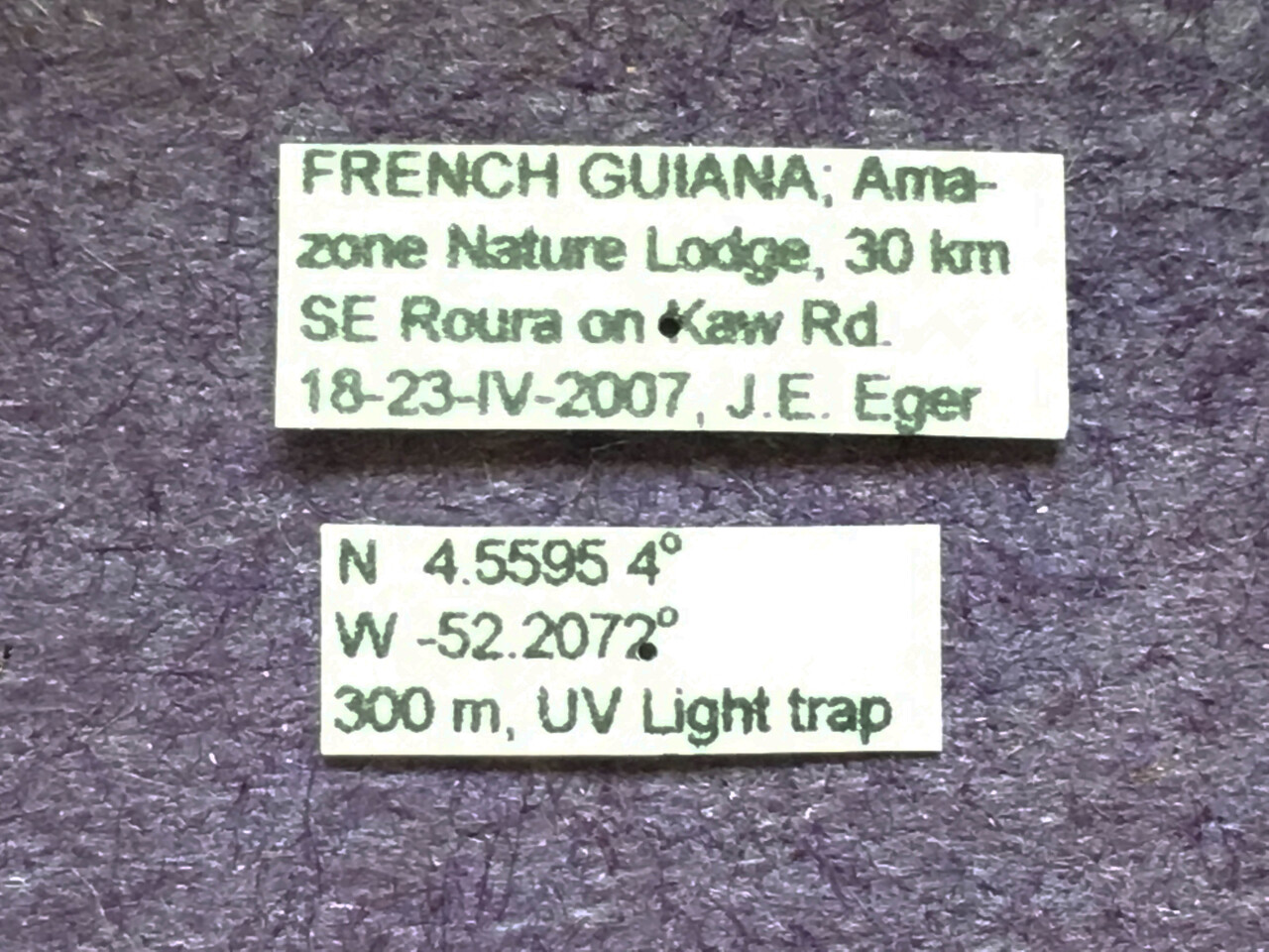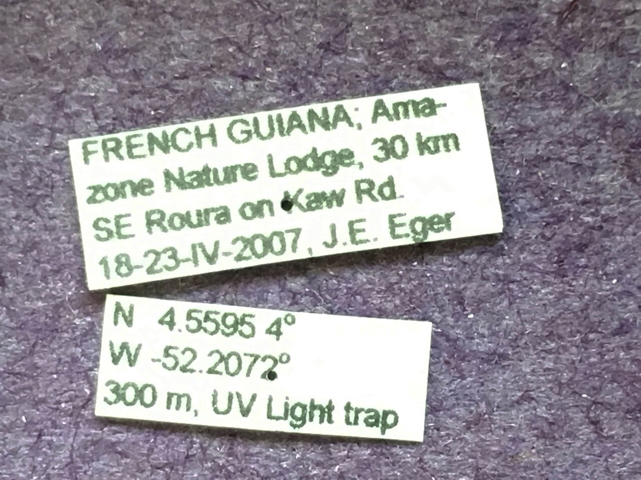 | French Guiana | Cayenne | Roura, 30 km SE, Amazon Nature Lodge on Kaw Rd. | 4.5595 | -52.2072 |